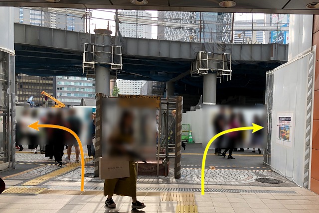 出て左(オレンジ矢印)に進めば、京王線入口と『京王百貨店』、右(黄色矢印)は、『小田急百貨店』と大ガード方面です。