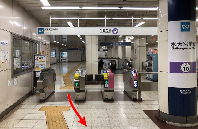 水天宮前駅には、2つ改札があります。目的地には、「水天宮方面改札」から出て、「出口7」を経由します。