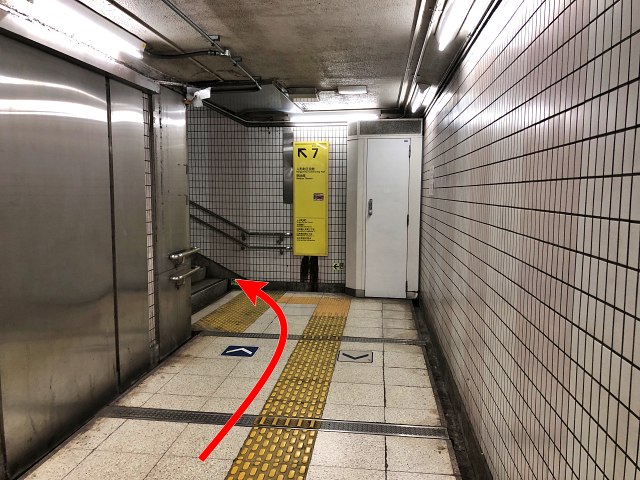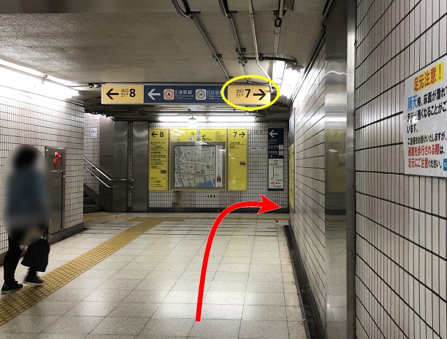 上に着いたら、前方の通路に進みます。「出口7・8」と矢印が出ています。
