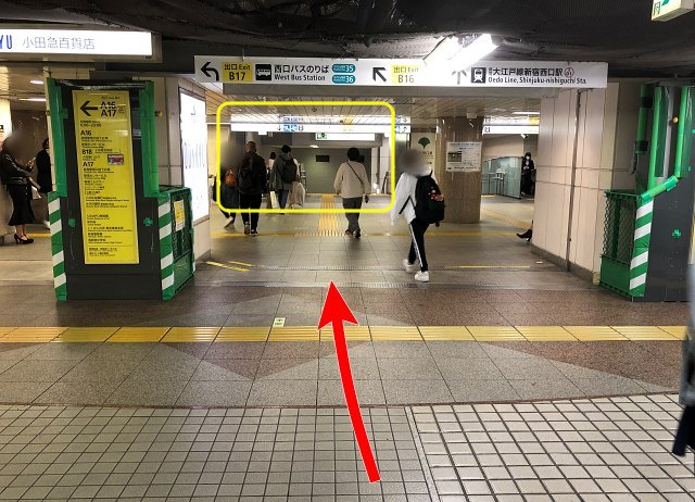 今回は、大江戸線・新宿駅「JR新宿駅方面改札」から、大江戸線・新宿西口駅「JR新宿駅方面改札」への行き方です。