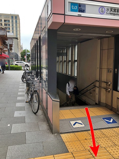 水天宮前駅の改札は2カ所、ホームから改札階にむかうエスカレーター(階段)は4カ所あります。4カ所のうち、渋谷寄り(1番線ホームで前寄り)の2カ所(のうちのいずれか)のエスカレーター(階段)を使って、「水天宮方面改札」へ。