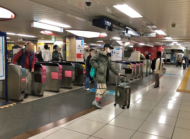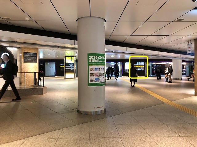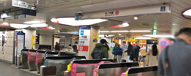 丸の内線やJR線の電車の発着で、丸の内線改札前の混雑の状況が変わります。人が多い時は、遠目では改札の位置が認識しづらいかもしれません。