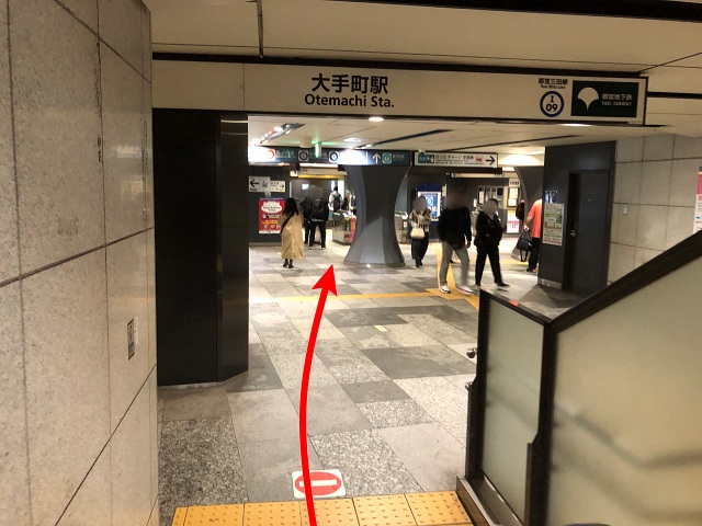下に着くと「大手町駅」の表示が。そのまま前に進めば、