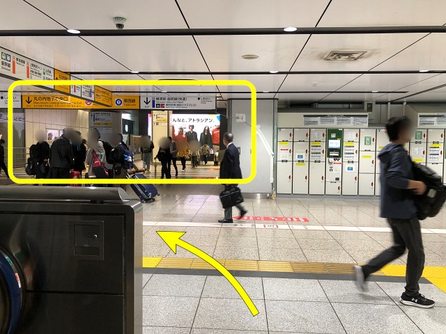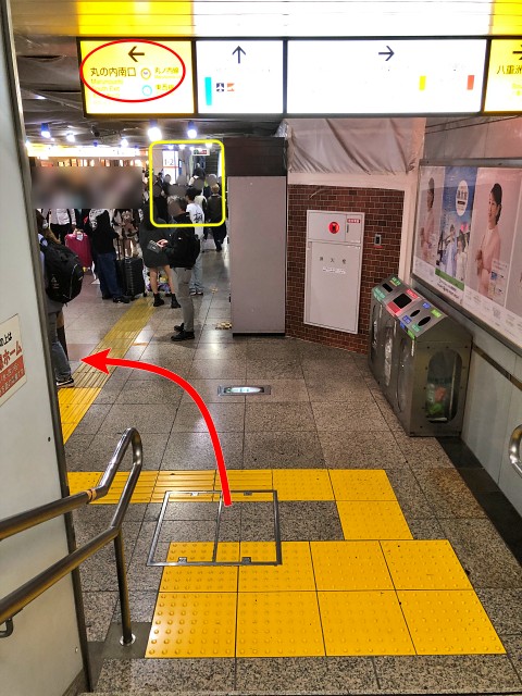 降りて左の通路を、右(黄矢印)に行けばまもなく「丸の内中央口」が、左(赤矢印)に行けば「南通路」です。