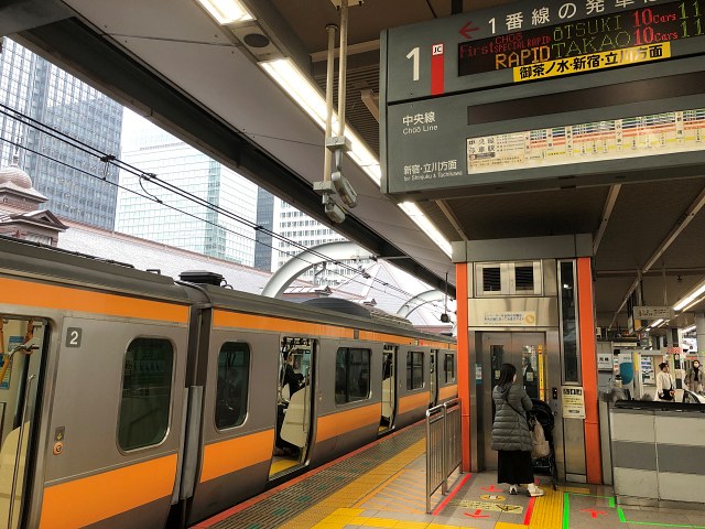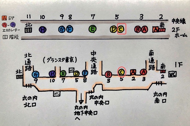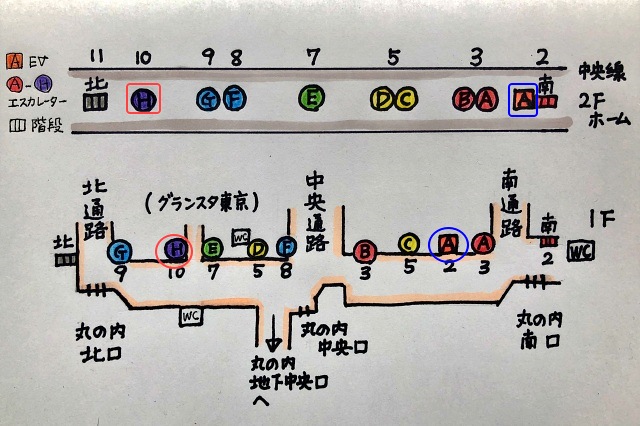 JR「東京駅」の中央線ホームには、A~Hのエスカレーターと北・南階段、エレベータ―が1基あります。
