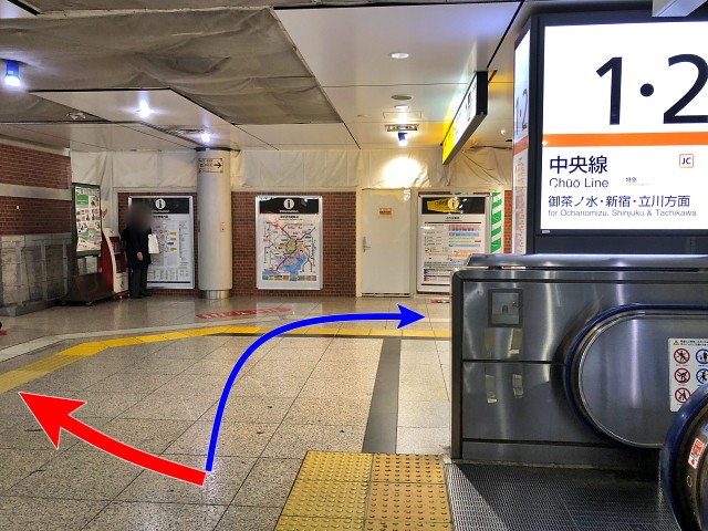 右前方(赤矢印)には「丸の内南口」。右後方(青矢印)に進んでいけば「中央通路」「北通路」の順にあります。