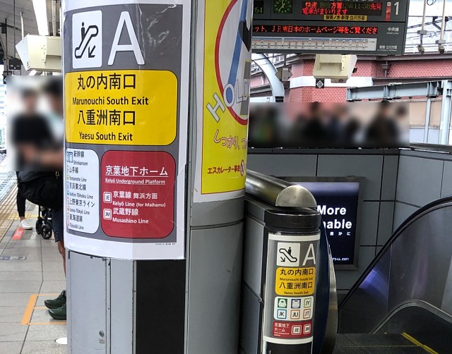 下りて左(赤矢印)が「丸の内南口」、前方には「南通路」に面したエスカレーター(A)が。