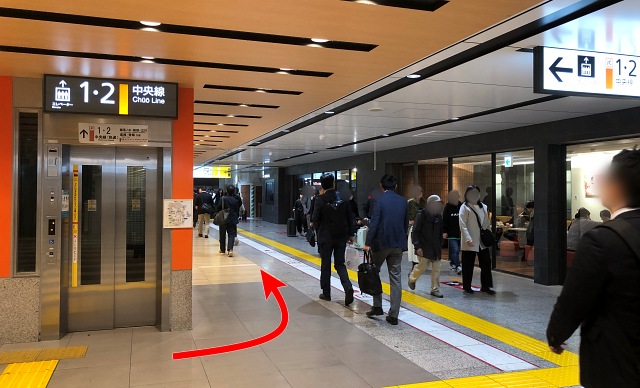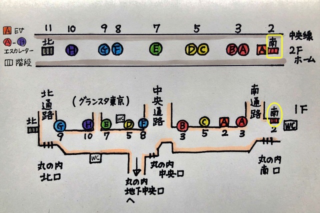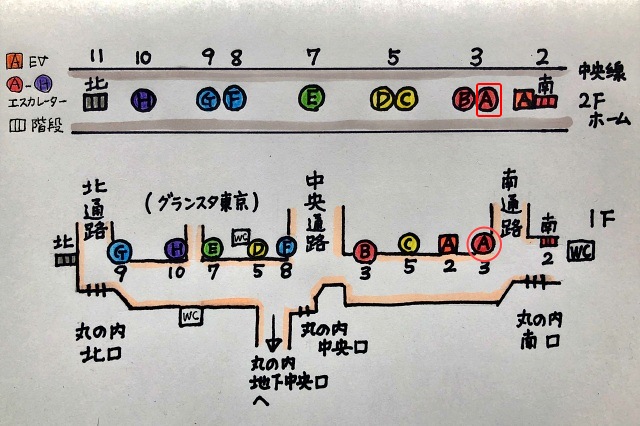 1階では、丸の内側の「南北の通路」上で「南通路」と「中央通路」の間にあり、エレベーターと向い合わせです。