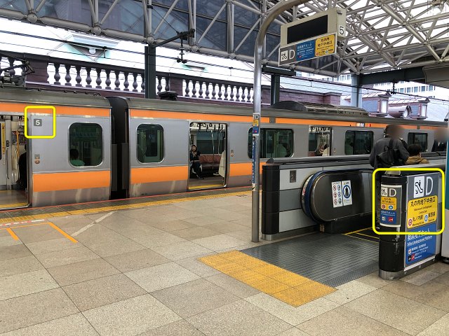 1・2番線ホームは、丸の内側にある地下階段に最寄りです。