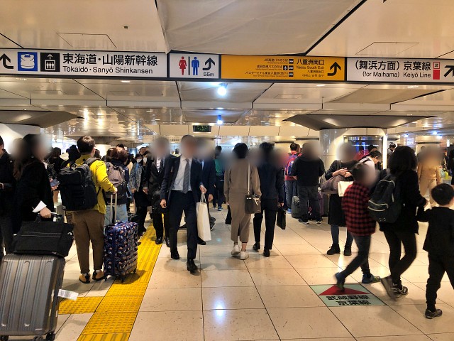 南通路を通って、新幹線のりかえ口のフロアにつづく階段付近は、「八重洲南口」に行く人や「京葉線」乗り換えの人たちも通るので、時間帯とタイミング次第ではワチャワチャです。「東海道・山陽新幹線」改札利用の際は、ご注意下さい。