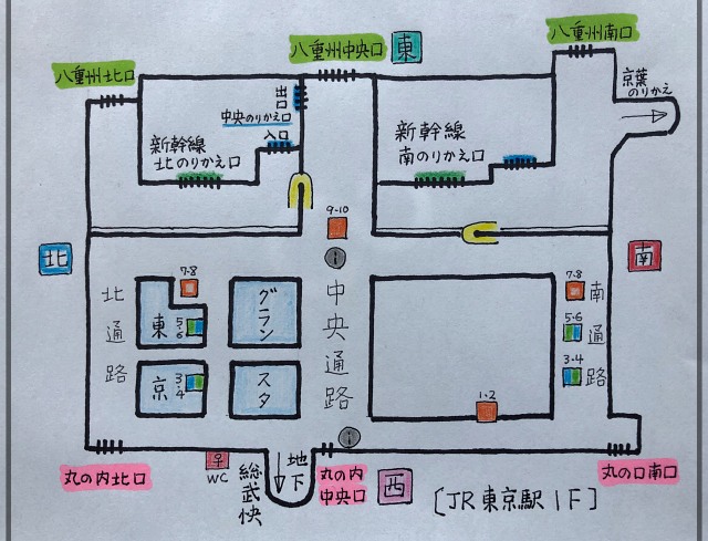 上記図上、丸の内側(西)は、下です。新幹線のりかえ口は、八重洲側にあります。のりかえ口は、青色が「東海道・山陽新幹線」で緑色が「東北・上越・北陸新幹線」です。