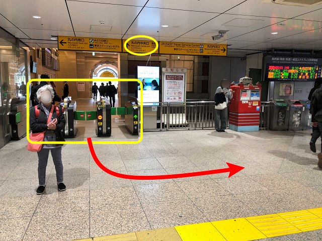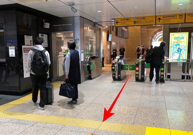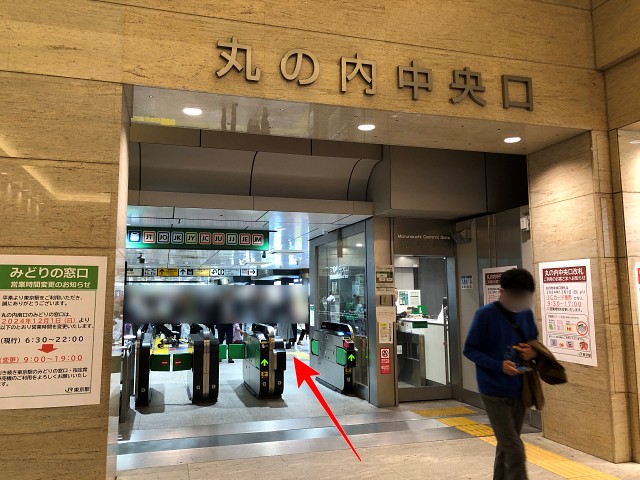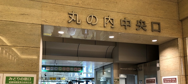 「丸の内中央口」は「中央通路」に続いており、新幹線のりかえ口の北側と南側のどちらを選んでもいい場所にあります。
