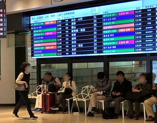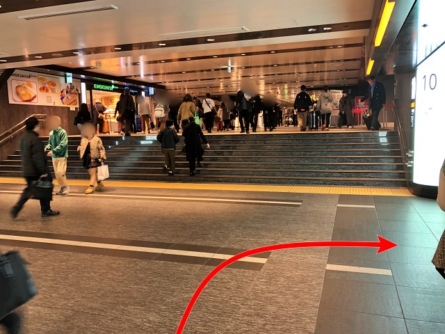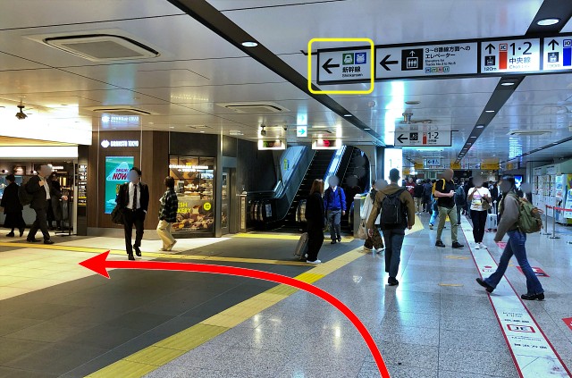 まもなくある『グランスタ』の通路へ。頭上の案内板に「新幹線」の矢印が出ています。