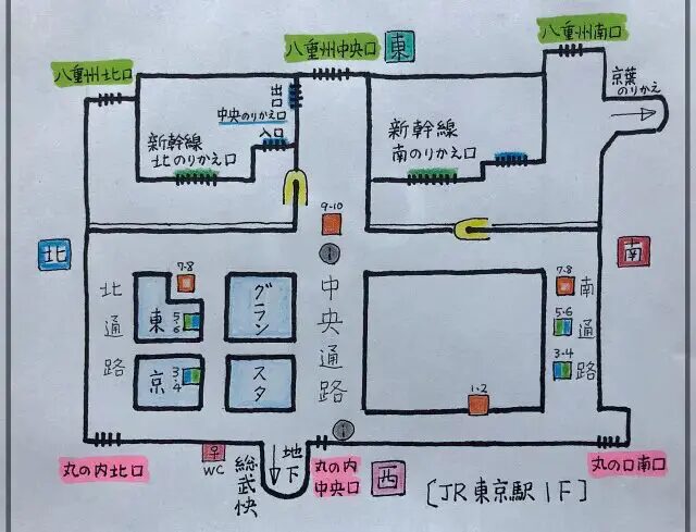 上記図上、丸の内側(西)は、下です。新幹線のりかえ口は、八重洲側にあり、青色が「東海道・山陽新幹線」で緑色が「東北・上越・北陸新幹線」です。