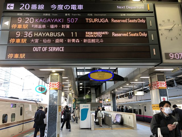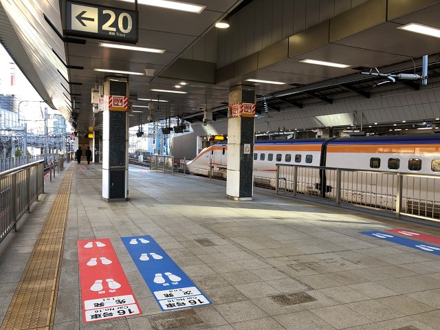 以前の記事でとり上げた通り、JR「東京駅」地上階にあるホームでは、記された列車の停車位置で、数が若いほうが「南」、数が大きくなるにつれて「北」にむかうというもの。これは、新幹線ホームでもあてはまります。