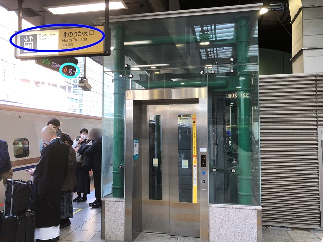 南側を後方に左手側が20番線。10号車あたりにあるエレベーター、やはり「北のりかえ口」行き。