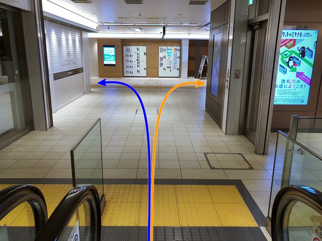 右(オレンジ矢印)に行けば、「地下中央通路」にぶつかる。