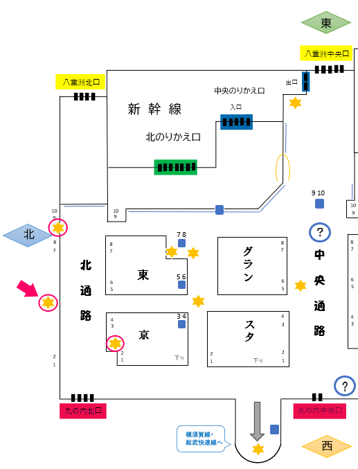 星印に桃色丸が「北通路」上にある地下行階段(エスカレーター)の場所です。