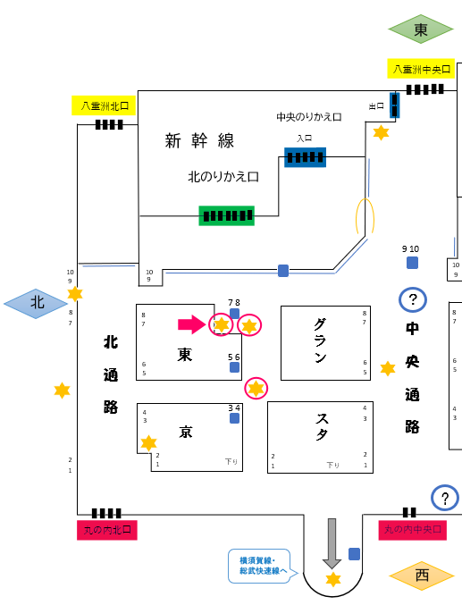 桃色丸で囲んだ星印が、『グランスタ東京』内にある地下行階段(エスカレーター)の場所を示します。