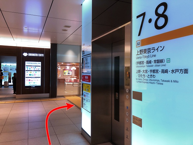 新幹線「北のりかえ口」前の階段を下りた通路から、『グランスタ東京』のほうに行き、7・8番線エレベーターを過ぎて右に行くとあります。