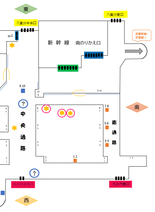 記事では、地下行階段(エスカレーター)の設置場所を、エリア別にとり上げていますが、今回は、JR「東京駅」1階改札内の「中央通路」より南側を3回に分けて投稿します。