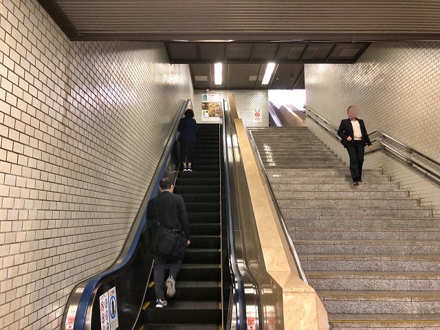 道なりに行くと、エスカレーターと階段が見えてきます。
