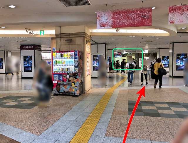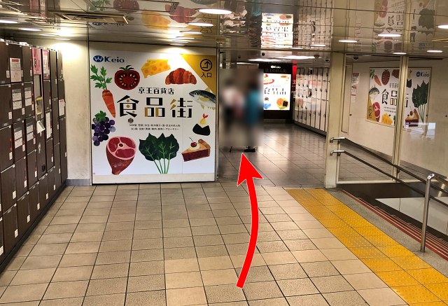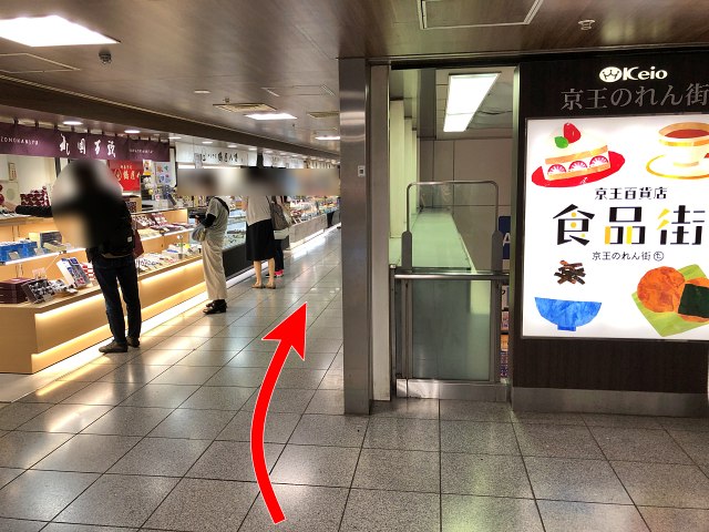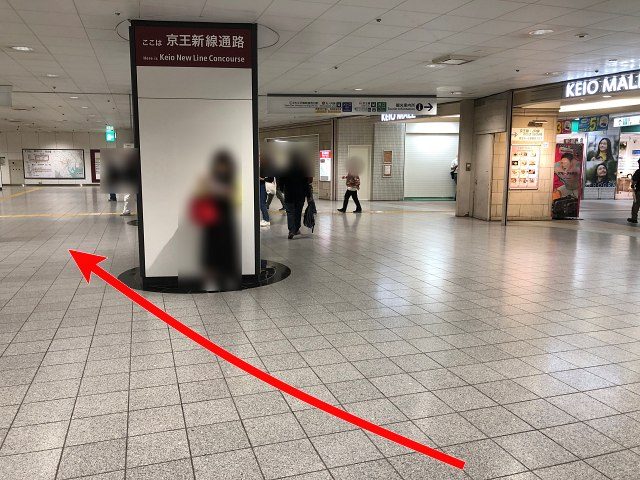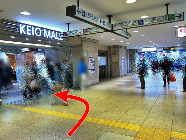 下に着いたら、左前方にむかって進みます。『京王モール』入口の延長線上に、京王新線(都営新宿線)の改札がありますが、それより右側をめざします。