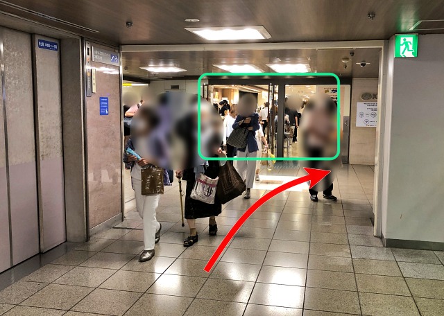 『のれん街』を抜けるとエレベーターホールがあります。前方の百貨店入口を右に。