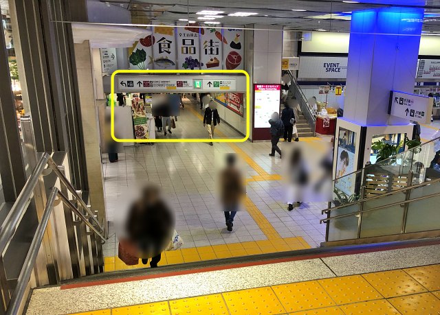 大きな通りに行きあたる手前に、『ルミネ1』の間口があります。頭上に案内板が出ています。入ってすぐ右のエスカレーターか階段で、いちばん下まで行きます。