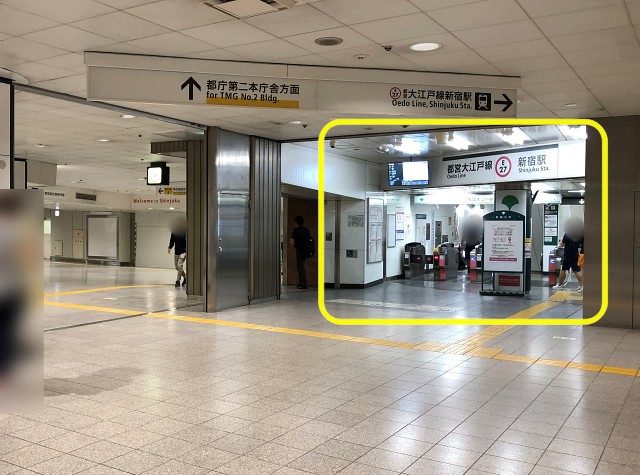 地下街を抜けて開けた場所が、「京王新線通路」です。そのまま前に進むと京王新線(都営新宿線)の改札がありますが、それより右側、壁寄りが大江戸線の改札です。